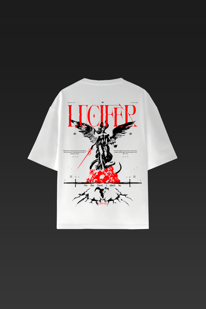 Lucifer reclaims the light-bringer myth — not as villain, but as challenger. Printed on white 240 GSM piece with dense graphic precision, this oversized piece tells a story of defiance, duality, and broken halos. Divine or damned, the message is yours to wear.