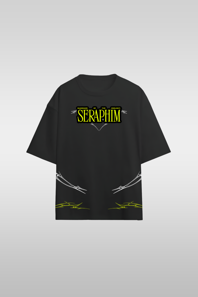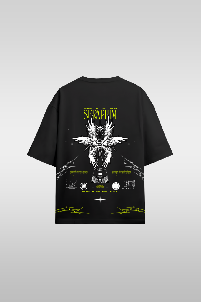 Crafted from 240 GSM cotton, Seraphim embodies the highest of the celestial order — fierce, watchful, and untouched by corruption. The back print showcases layered wings and sacredgeometry, channeling power through chaos and symmetry. This isn’t a graphic tee — it’s armor from the light realm.